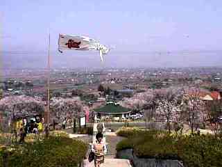 手前のピンクは桜、後ろの甲府盆地に