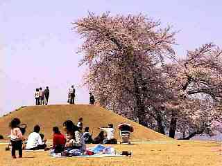 八代町ふるさと公園の大きな桜と古墳