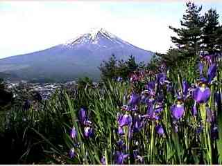 6月上旬富士吉田市尾垂山。アヤメ畑のバックにある富士は白い化粧が多く残っています。 |