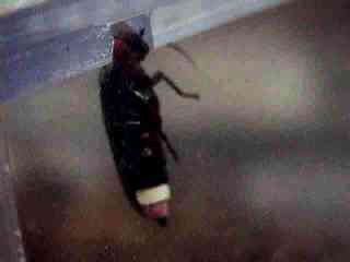 源氏ホタルの成虫でメスです。尻尾の先の白い部分が発光体で夜点滅するそうです。オスは最後尾の赤い部分も白い発光体になっているので区別できるそうです。 |