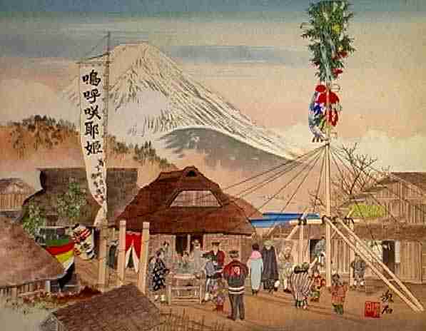 上に用いた絵は定方塊石という人の版画です。 富士山の周辺の様子を「酒勾川と富士」と題したシリーズで 昭和10年代に出版したもののうちの一枚です。 河口湖と思える場所の新年の様子を非常に情緒豊かに表現していましたので 20世紀最初の絵として取り上げさせていただきました。 |