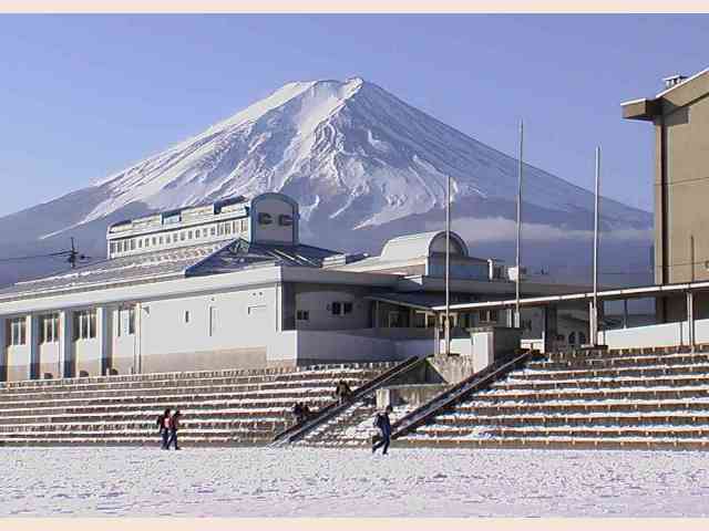 | 新年の登校を見守る富士(上:富士吉田市立第二小学校、著者の母校) |