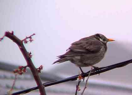 左はムクドリです。 お隣の家の電線に羽を休めているところです。 雨でしたので、身体を丸めて寒そうでした。 富士北麓ではヒヨドリほど多くは見られませんが 静岡県掛川市とか群馬県高崎市などの駅前の大木に 木の葉以上と思えるほどの大群で群がっているのを見たことがあります。 きっとこの鳥ではなかったでしょうか ねぐらとするため集まっていたのだろうと思いますが 夕暮れですので気持ち悪いぐらいの大群でした。 富士北麓ではまだ大群を見たことはありません。 |