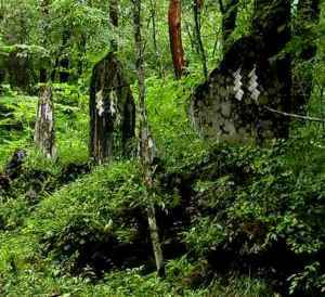 入り口の鳥居をくぐると回りの様子は一変します。丸尾の石の上はコケが覆い、木々の葉が上空を覆い樹海の中そのものです。野鳥の声は急に多くなり、すぐ頭上で羽音が聞こえます。周囲にはさまざまな野草や低木があり、自然と足を止めたくなります。 すぐそばの沢の木々は上から見下ろすので、野鳥を観察するのにも適していそうです。(7月は木の葉が多く野鳥観察時期としては不適)背の高い木は赤松が多く、その他にも名前の分からない木々や草花がたくさんあります。(胎内周辺の花参照) 吉田胎内洞窟の場所は再び鳥居Dがあり、少し右奥に入ります。しかし、この場所は小屋もあり、周囲には石碑が並び小さな広場になっています。胎内洞窟Eは階段を下りたくぼ地にありますが、現在は鉄格子があり内部には入れません。 昔、それもかなり昔(江戸〜明治)、吉田口登山道が最盛期の頃の地図や絵(富士山真景の図など)を見ると、中の茶屋からここまで道があり、大勢の人がここに参拝していたようです。多くの石碑はその名残かも知れません。吉田胎内洞窟の周辺の野鳥の声は、車道近くの野鳥の声となんとなく違っているように聞こえました。(400m程度奥だけですので気のせいだと思いますが) 胎内洞窟は入れませんが、周囲には樹形溶岩を見ることが出来ます。 ここより奥に道は続いていますが、まだ入ったことは無いのでどこに続いているのか不明です。(すぐ奥にはスバルラインが通っているので、たぶんそこに出るのだと思います)また、沢に下りる道もあり昔の中の茶屋への道も続いていると思いますが、これも未調査です。