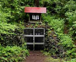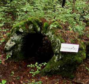 (写真左:胎内洞窟、上:胎内洞窟周辺の石碑、下:小さな溶岩洞窟)