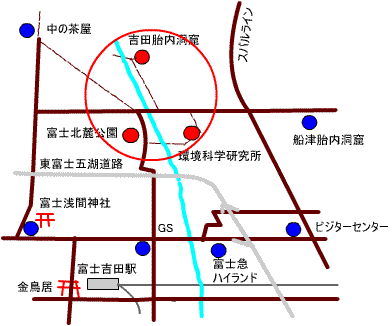 吉田胎内は富士山の溶岩で出来た洞窟です。 富士北麓公園の近くにあります。2001年現在内部には入れません。 そのためかここを訪れる人は少なく、逆に自然がそのまま残っています。 近年、近くに山梨県の環境科学研究所ができ、樹海内の散策道が整備されてるので 吉田胎内と合わせて半日ぐらいかけて回ると富士山麓の自然の一端を楽しむことが出来ます。 ここでは富士北麓公園から吉田胎内、そして環境科学研究所を回って 富士北麓公園に戻るコースをご紹介します。(注意書きの無い写真や図は今回作成) |
