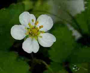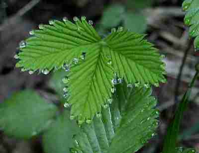 シロバナノヘビイチゴ 7月1日現在は右のように実を付けていると思います。 このいちごはまずくて食べられませんが 焼酎に漬けて薬?として 使われているのではないでしょうか。 それにしても右上の葉を見て下さい。 水玉で見事に装飾されていますね。 |