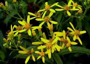 目立つ花である。 背丈もあり、うちわを空に向けたようにして その先に鮮やかな黄色の花が群生したようになる。 |