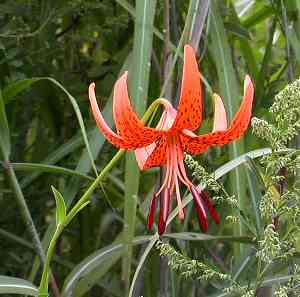 花と言えば「ゆり」はやはり代表格だろう。 富士山を少し上に行くとクルマユリが見られるが、これはコオニユリで、どこにでもあるゆりのようである。 しかし、演習場の中で、緑や黄色の中にこれを見つけると、「あった」と言う感じになる。 |