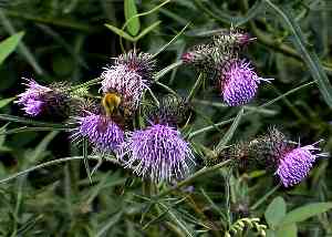この花の蜜はおいしいのか、いつも蜂がいる。富士アザミは馬鹿でかくてびっくりする大きさだが、こちらのアザミはかわいらしい大きさである。 |