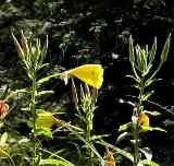 オオマツヨイグサ 「月見草」の名前で知られている花で8月にはいたるところに咲いている。雁の穴も高速から入り口までの車道脇にたくさん咲いている。これは「月見草」ではないとの専門家の指摘もある。 富士北麓にはメマツヨイグサもあり外観は似ている。 |