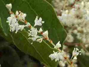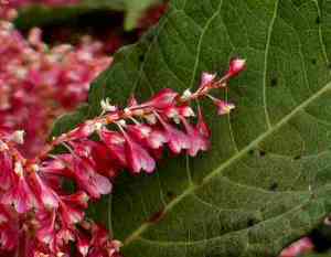 | (上)オンタデとイタドリ(右上)は同じような場所に咲く。大きな株が交互に咲くと白と赤で見事である。 | |