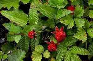 「ヘビイチゴ」 写真の丸い葉がヘビイチゴだと思う。 三角の葉のいちごは何だろう。 同じところに二種類のいちごが 成っていた。 |