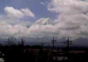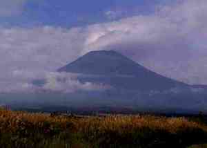 9月中旬富士は夏の姿をしていた。11号、12号と連続して台風がやってきた。 雨が続いた。 それでも富士が雪化粧することはなかった。(写真:北富士演習場9月2日) |