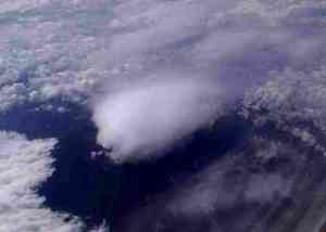 三連休の前日、雨模様の天気に西高東低の気圧配置が重なり、気温が急速に低下した。 そのときの富士は左のように大きな雲の傘をかぶって頂上は見えなかった。(写真:JAS機より21日) |