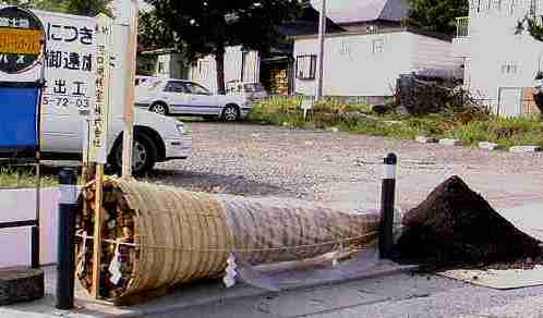 | 26日朝、人通りはない。歩道に横たわる松明。夜この松明が道路の真ん中に立てられ火が点けられる。 |