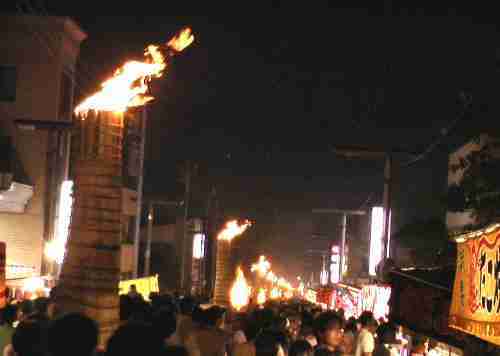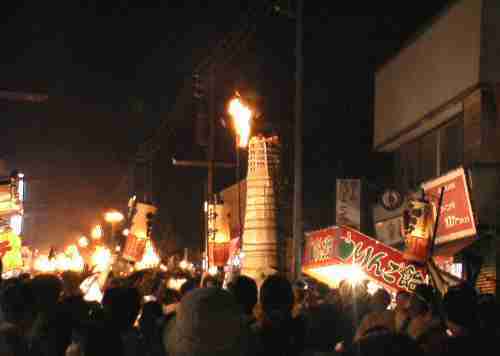 | 御輿をかついできた若者によって大松明に火が点けられる。同時に、各家々の前の薪にも火が点けられ、およそ1.5kmが燃え盛る通りと化す。 |