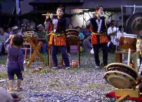 | 地元の太鼓の演奏など、色々な催しも行われる。心もお祭り気分。こどもも演奏にあわせて踊り出す。 |