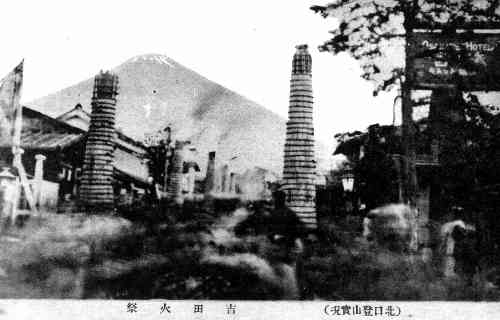 上の写真は大正時代頃と思われるが、当時の火祭りの松明だ。通りの中間にある刑部旅館の前から撮影したものだ。火祭りは200年以上続くお祭りだ。始まりは定かでないようである。この祭りのことについて北口本宮富士浅間神社が発行した「鎮火祭」(平成8年発行300円)が詳しい。 吉田では火祭りで夏が終わり、秋に入る。よく見ると上の絵葉書の富士には雪が見える。今日2001年9月2日の富士にはまだ雪はない。しかし、めっきりと回りは涼しくなった。 (上の写真は瑞穂通信所有の絵葉書から) |