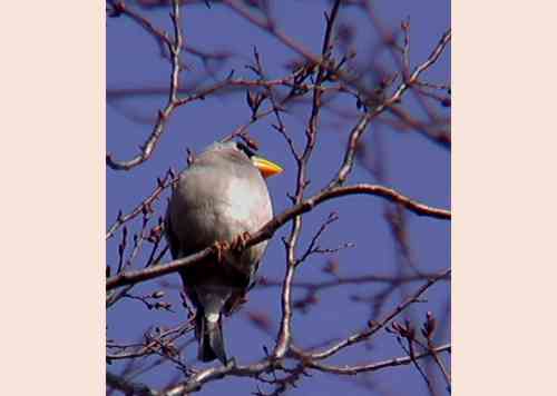 | イカル:鳴き声が特徴あるのですぐ分かる野鳥ですね。しかし、ひなたぼっこをしているように集団でとまっている時はすぐ上にいるのに気がつかないものですね。富士吉田市大明見 |