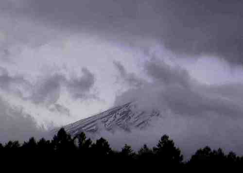 上:湧き上がる雲に絡みつかれたような富士。 富士吉田市北麓公園より撮影 |
