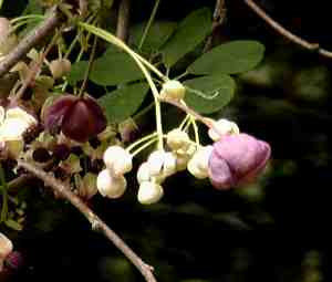 アケビ 紫の丸いのが雌花で小さい白いのがおしべのようです。 |