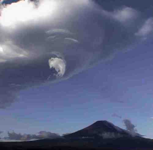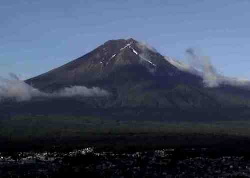 上:7月7日富士山は上のような夏肌を見せてくれた。 上の登山者たちの写真は同日の五合目から六合目での様子だ。この日は早朝下のような吊るし雲が発生、富士吉田市の忠霊塔でこの写真を撮り、すぐに五合目に移動した。富士山でも猛烈な風が吹いていた。登山道では小石が雨のように顔にぶつかり、足元からは砂塵が舞った。真夏のような数ではないが、六合目の吉田口とスバルラインへの分岐では、昨日からの登山客が大勢下山していた。昨夜6日はすばらしい天気で、下から山小屋の明かりがきれいに見えていた。夜空に浮かぶ山小屋の明かりは富士北麓の夏の風物詩となっている。この灯が見えると夏を実感する。しかし、登山道での気温は寒く、風も強いので冬山登山同様しっかりした装備をして登る必要がある。立っていると飛ばされそうになる強風と横殴りの小石、山頂までまっすぐの登山道。小石でなく溶岩が落ちてくることも充分考えられる危険な場所でもある。今年の夏が無事故に過ごせるためには登山者の準備も不可欠である。 |