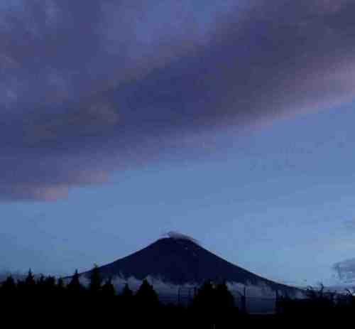 下:円盤のような、きゅうりを横にしたような雲が富士の横に漂っている。 上空には今まで悪天候を造っていた厚い黒い雲が残っている。その下に真っ青なエメラルドグリーンの空、目の前が急に開けたような空の演出だった。 |