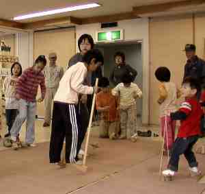 | 竹馬乗りの練習を楽しむ参加者 | |