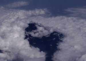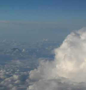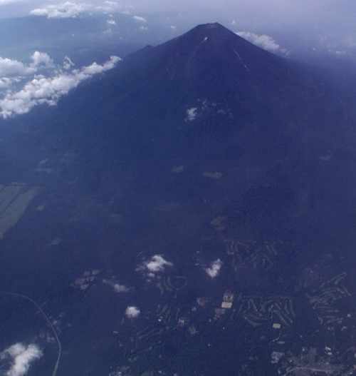7月は雲が多く、地上からも上空からも富士の姿を撮ることはできませんでした。わずかにあったチャンスも右のようにごく一部でした。それにしても雲の大きさはすごいですね。あの大きな富士山が豆粒みたいですね。 |