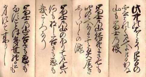 富士講で登山する人が持っていた折本(左)が見つかりました。左の折り本は手帳サイズで表紙の裏には身禄の「御身抜き」と呼ばれる文字が書き込まれ、続いて身禄の教えが記載されているようです。残念ながら、文字が良く読めません。少し勉強して読めるようになりたいと思います。 | ||||||||