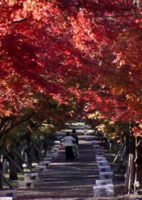 富士吉田市内の郡内産業振興センターから富士吉田市歴史民俗博物館までの間が「心静かに紅葉を観る会」が11月3日まで開かれています。国道を挟んで道の駅もあり行楽スポットの1つとなっています。右はその散策路、下は富士山レーダードームと富士山と紅葉。 |