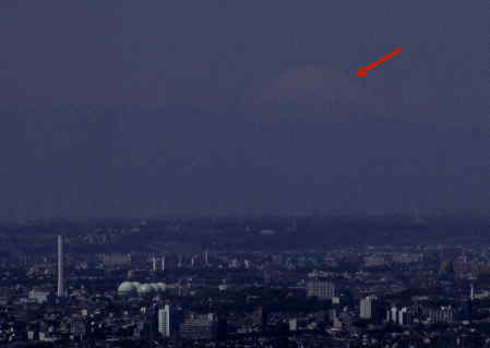 4月29日緑の日、快晴でした。左はその快晴の日、都庁展望室からの富士、矢印の先にぼんやり見えるんですが、分かりますか?。厳しいですね。都庁展望室の開場は午前9時半、きれいな富士山を見るのにはちょっと遅いんですね。6時とは言いませんが8時ぐらいに開くといいんですが・・・・ |
