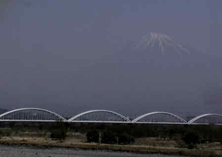 右は出張途中の電車から撮った富士川からの富士。空中に浮遊しているようでした。やはり南側、雪が少ないですね。 |
