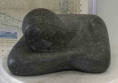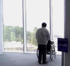 | 駐車場から建物までは相当の距離があるように見えるのは、芝生の広場があるからだ。もしかして、この広場は裾野を表現しているのだろうか。建物までの道は芝生の左側に登山道のように建物に続いている。こんな感慨とは無関係に芝生の上では大勢の親子連れが連休の一日を楽しんでいた。連休はじめの正に五月晴れの一日だった。私はこの日一人だったので、なんとなくそんな家族連れの雰囲気を楽しむゆったりとした気持ちはなく、レーダードーム館内部を早く見たいと言う気持ちに誘われて、そそくさと建物に向かった。登山道を模したと思えるレーダードームまでの階段脇に展示室入り口がある。エントランス正面に「想う女」の石彫が迎えてくれる。なんとなくうつろな目の女性の彫刻である。富士吉田市内や東京など各地に石彫を提供している富士吉田市出身の彫刻家浜田彰三氏の作品だ。暖かさで定評のある氏の作品は富士山レーダードーム館に人間の暖かさをかもし出してくれる。(浜田彰三氏の作品は氏のサイトで見ることができる。) | ||||||||||||||