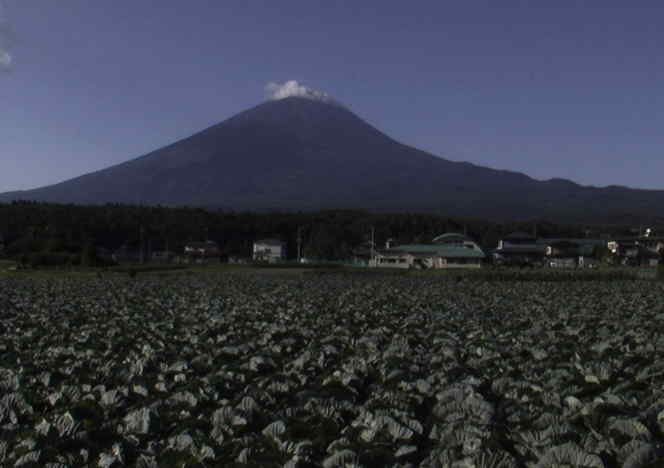 夏の朝、富士山には全く雲がなかった。陽が昇るに従ってどうしたことか雲が湧いてくる。私の第二のふるさと鳴沢村ではキャベツが最盛期を迎える。ここからの富士山頂は平らではなく、三峰の形をしているが湧き出した雲はその三峰を覆うようにして、やがて裾野に向かって大きくなる。左の写真は富士山の北側から撮影しているので、雲はいつも山頂より左に流れる。偏西風の影響だろうか。キャベツ畑の向こうに樹海と富士が広がる夏は最高の環境だ。 | |||