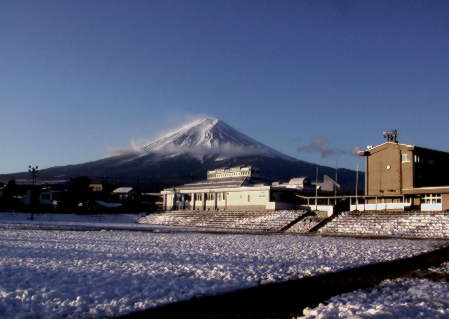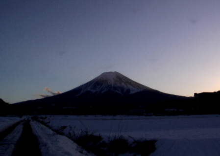 富士を観るのはいつが良いか。聞くまでもなく冬と答えるだろう。四季を通して冬の富士が最も好まれる容姿に異論がない。しかし、いつ観ても飽き飽きするのも冬の富士だと答えたらお叱りをうけるだろうか。雲ひとつない冬富士は真っ青な空に威厳を漂わせて聳え立っている。偏西風に飛ばされきれなかった残雪がまだらにへばりついた側壁は人を頑として受付けない堅物のようにも映る。晴天が続くと、本当に毎日飽き飽きするぐらい同じ顔を見せてくれる。しかし、しかしである。晴天でも早朝とか、夕方には違った顔を見せてくれるのを忘れていた。飽き飽きするのは、毎日同じ時間に見ていたせいだった。早朝6時、まだ暗い2月富士山は巨大な黒い山だ。しばらくすると東の山の向うが薄明るくなり、富士山頂が黒から赤に変化し始める。信号機の点滅が明るく見える。紅富士と呼ばれるように、白い山肌が紅潮したようにピンクに染まる。吐く息はタバコの煙のようにはっきりと見える。雪解けの水が路面に凍り付いている。富士北麓は、まだ、冷え込んで、しじまの中だが、日本一高い富士山は早くも始動を始めている。ほんの数分で天空が明るくなる。さっきまでのピンクが真っ白に変わる。明るくなるとなぜか富士山中腹北側に雲が出てくる。やがて雲は富士山の中腹に帯のように漂う。雲は西から東に、北富士演習場の上空に伸びていく。山頂から宝永山の方向に伸びる稜線にも舞い上がる雲が踊る。この雲は実は雲ではなく、山腹の雪が風に舞ってできた”雲”なのだ。山頂からは東に水平に細い雲が筋をつける。これも雪が飛ばされたものだろうか。もしかすると、雲と雪とが混ざったものかも知れない。目の前の信号は景色の中に溶け込み普段の町並みの向こうにどっしりとした富士が、どこかの寡黙のおやじのように座っている。飽き飽きするけど、いないと困る頼れる富士がある。日が沈む頃、ちょっとブルッと感じ始めると同期して、朝わきたった雲がサーッと引いていく。富士の稜線がくっきりと空と地上とを区分する。下界が薄暗く、再び信号機がサンサンと輝きを増す頃、富士を見上げると大室山上空から左上にサーチライトのような光がくっきりと現れる。やがて、その線は山頂めがけて登り始める。夕方の紅富士が瞬間に現れる。瞬きをする間に富士は真っ黒なシルエットに衣装換えする。やがて長い長い時間をかけて天空も緻密なブラインドをゆっくりと閉じる。小さな、しかし無数の輝きが天空をちりばめる。夜のしじまに再び富士が溶け込む。画家の千住博はフジヤマミュージアムでの「流星」発表会で雪を冠した富士を見たとき「アイスクリームのように食べたくなる」富士と表現した。飽き飽きするような変哲のない昼の冬富士にも、こんな見方もあったのか。冬富士、人々を万葉の昔から魅了する富士が今年もそこにある。 |