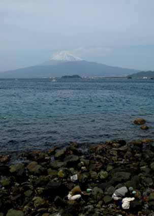| 晴天が続いた4月後半から連休、各地からの富士もきれいでした。 下:山中湖畔を走るランナーと「農じい」が現れた鳴沢村からの富士 右下:伊豆三津海岸で海藻を採る家族 |