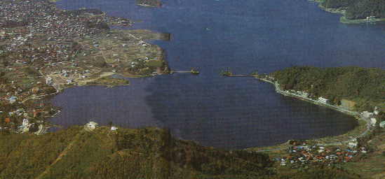 この意味で「河口湖は変わる」と思います。もっとも、30年サイクルでの変化です。道路は生活を大きく変えてきています。これからどのように変わるか注目したいですね。 ところで、下の35年前の河口湖、ホテルや家が少なかったですね。私がS46年初めて社会人となった年です。今日大橋を記念に通行してみました。通過時間はわずかでしたが35年を振り返ると感慨深い通行でした。 |
