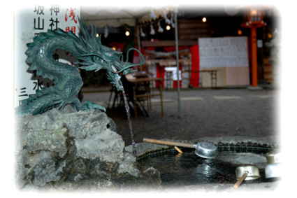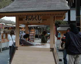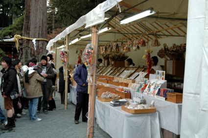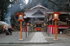 | 次に向ったのが下吉田にある小室浅間神社、現在も流鏑馬を行っている数少ない神社です。神馬となる白馬が境内で飼育されています。昨年の流鏑馬の時だったでしょうか「富士山御神水」と言う水を販売したのもこの神社でした。新年も販売していました。 富士北麓で最も大きな浅間神社が上吉田にある北口本宮富士浅間神社です。富士講の村上清光から寄進された大灯篭が並び、樹齢数百年の大杉が立ち並ぶ昼でもうっそうとする参道の先に国内でも最大級の木造大鳥居があります。大鳥居から随身門まで両側に多くの屋台が並びます。元旦の朝、午前零時過ぎにここで飲む甘酒は体中があたたまります。今回は、午前10時前だったせいか、ガチガチにかじかんだ寒さはなかったのですが、恒例のように甘酒をいただきました。境内でも参拝客の行列はなく拍子抜けの初詣をゆったりとしました。私の後に、犬をつれた夫婦が参拝していましたが、元旦の押すな押すなの行列がなかったので、上の写真のように犬もゆったりと参拝していました。(ちょっと横を見ていますがね・・・。午後は大変な行列だったそうです。) 勝山の富士御室浅間神社では宮司が大きな鯛やお供えのお餅を本殿に運んでいました。 |