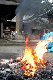 | 富士北麓、平成18年(2006年)新年はどんよりとした空模様でスタートしました。日本海側や東北、北海道では大変な豪雪になっているようですが、富士北麓地方は雪もなく、平穏な新年です。富士山も風で飛ばされた残雪の白いすじの羽織を軽く羽織ってその雄姿を見せてくれました。左の空にはやや怪しい黒いつるし雲、良く見る景色がありました。「数打てばあたる」と思ったわけではありませんが、山麓の浅間神社の初詣を「はしご」してみました。 富士吉田市の北側の山(尾垂山)の中腹に朱色のあざやかな五重の塔(忠霊塔)があります。この登山道入り口にあるのが、富士浅間神社です。参道は桜の季節にみごとなピンクの桜と白い富士山がカメラマンに人気のスポットです。その参道の脇に駐車場への車道があります。普段、忠霊塔へ通じる車道も元旦は通行止めになっていました。お祝いのお酒でしょうか、白い大きな箱を持って神社に向かう夫婦が車から階段をいそいそと上っていきました。元旦の富士浅間神社はかがり火がたかれ、厳かな雰囲気が漂っていました。午前9時ごろだったからでしょうか参拝者は少なく、祭司の人が数人、これから忙しくなる元旦の朝の支度にあたっていました。この境内からは富士吉田市内と富士山が180°展望できます。 |