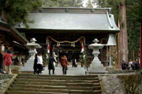 | 午前10時から今年の厄年の人に厄払いの祭事があるとのことで、忙しそうでした。 河口の浅間神社には既に着飾った老若男女が大勢集まっていました。おそらく、今年の厄払いの人たちでしょう。参拝者も大勢になってきました。 河口は古い御師の街です。今でも当時の面影を残す門などがかろうじて残っています。現在でも御師の末裔が宮司を勤めている歴史を刻んでいる神社の一つです。 |