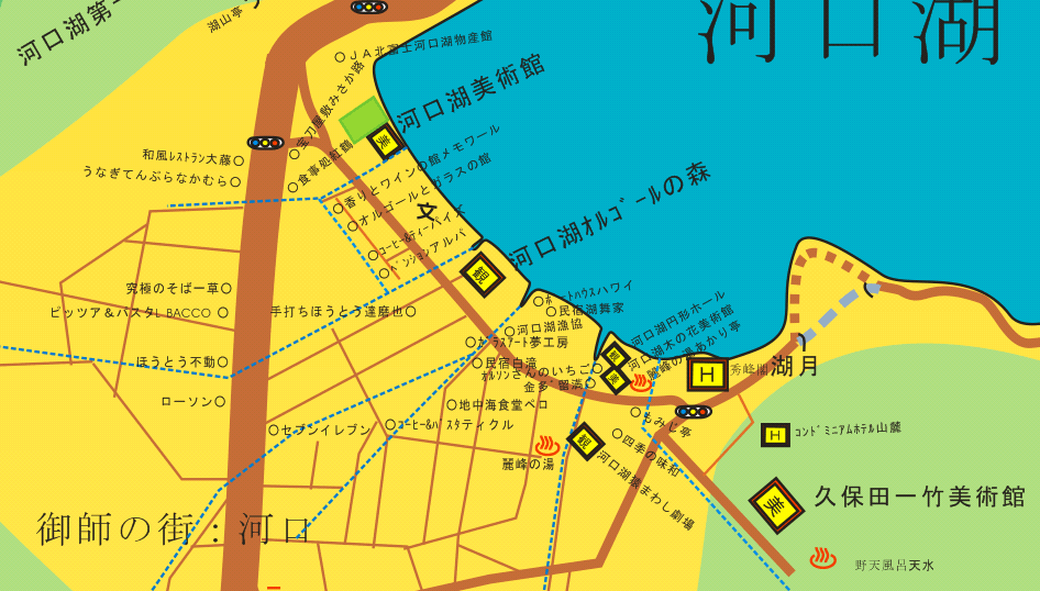 | 河口湖美術館、オルゴールの森、湖月、猿まわし劇場、金多留満、木の花美術館、クラフトパーク、久保田一竹美術館、天水、富士河口湖町、みさか路、ほうとう不動 | ||||||||||