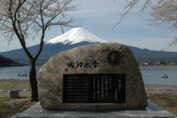 メルヘンの世界・円形ホール周辺 レイクサイドホテルのグランドと西川の間に「拓魂」と彫られた石碑が立っている。整備された湖畔から国道の間は山梨県内ではめずらしい干拓地 で、その完成を記 念して建てられた石碑だ。この周辺からの富士山と桜の景観は最高で、今年も大勢のカメラマンが撮影に訪れている。