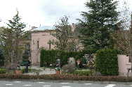 レストラン前から富士山を望むとチャペルの入り口のようなベルがある塔が建っていて、ここにも石碑がある。昭和生まれの人にはなじみの顔と楽譜が刻み込まれている。古賀政男と「影を慕いて」だ。銘文を見て「なんでここに?」の謎が解ける。レストラン「オルソンさんのいちご」の隣は「木の花美術館」で絵本作家池田あきこさんの「ねこのダヤン」の原画を展示している。円形ホール周辺はメルヘン の小さな世界に入り込んだ雰囲気をかもし出している。
