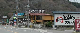 ほうとう&レストラン 近くには山梨名物の「ほうとう」をだす店がたくさん出来ている。美術館向かいの「宝刀屋敷みさか路」は外に高級スポーツカーが置いてあり驚かされるが、店内にはアロワナの水槽があり再びびっくりであり、面白いお店だ。れっきとしたレストランで、ほうとうもあるが、うなぎから焼肉まで色々な メニューがあるのでお店のホームページを見て欲しい。国道をはさんで「大藤」もほうとう、ヒレカツ、焼肉となんでもありのレストラン、少し離れるが国道137を甲府方面に向うとすぐに「ほうとう不動」がある。ここはほうとう専門で混んでいるが注文してから出てくるまでが早い。味もお勧めだ。美術館通りには、「オルゴールの森」駐車場近くに手打ちほうとう「達磨也」、もみじ回廊入り口にあるほうとう・そば・うどんの「もみじ亭」がある。