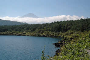 | 西岸の溶岩岸壁と富士山→ いやしの里と富士山↓ |