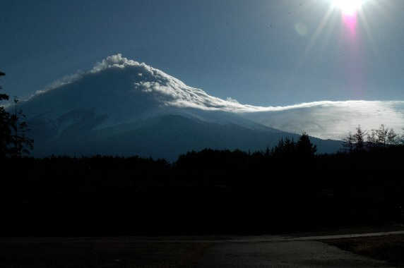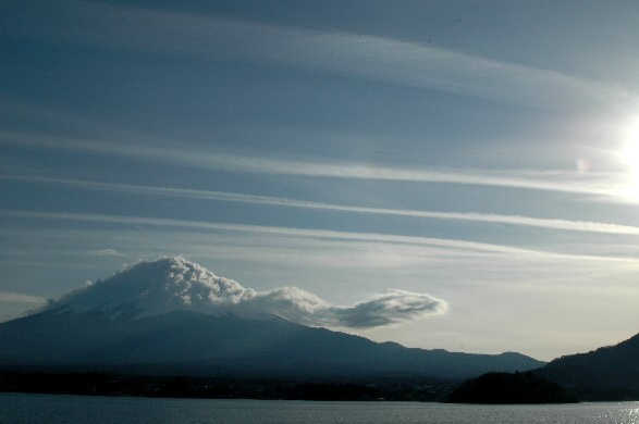 午後河口湖から撮影しました。 なんとなく竜が太陽に向うように見えませんか? 首の長い亀にも見えますね。 |