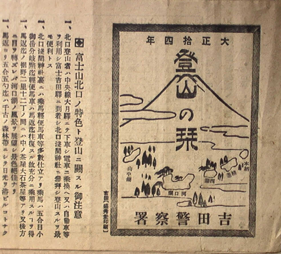 | 図16:胸突八丁を登る参詣者 | 図17:吉田警察発行 登山のしおり(大正14) | ||||||||||||||||||