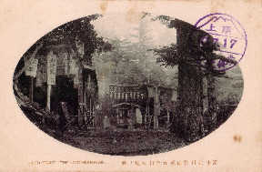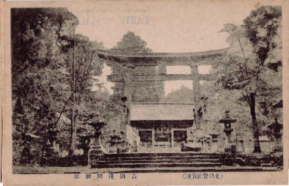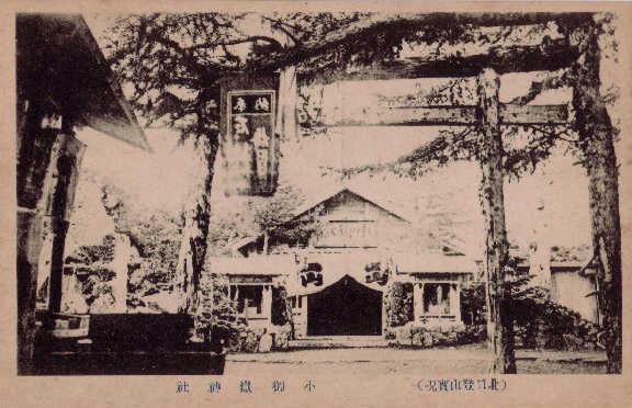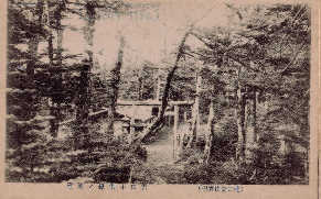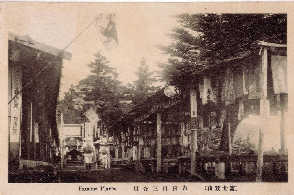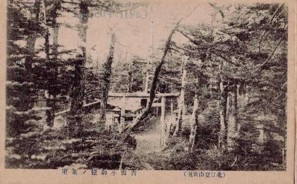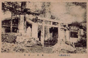 多分大正から昭和初期のポストカードだと思うが、そこに残る写真を使って当時の吉田口登山道を見てみよう。 左の写真は北口本宮浅間神社大鳥居から随身門を写したものだ。左下は珍しいアングルだが横から浅間神社を撮ったものだ。 図3と4は馬返しだ。鳥居は現在(2007年2月)も同じ位置にあるが修復されている。図3の建物は残っていない。図5は1合目の鈴原神社で鳥居の左の建物は現在も残っている鈴原神社。右の建物は山小屋らしいが、現在は残っていない。この鳥居も現在ないが、鳥居から下に伸びる登山道が復元整備 |